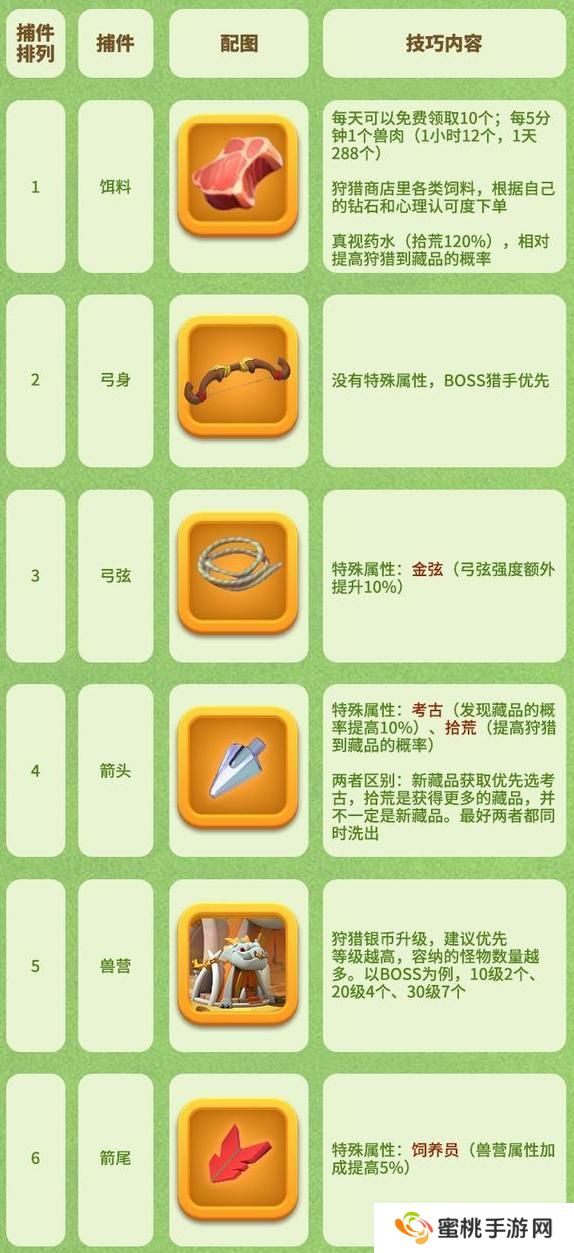 1、捕具升级优先:个人建议从箭尾→弓弦→弓身→箭头。阶差最好不要超过2级