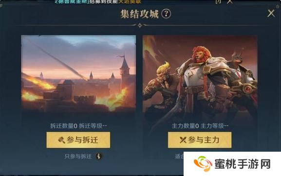 城主们在进行集结时,可以在聊天框中看到集结按钮,选择相应的部队即可分别进入到主力攻城或拆迁集结中。集结时间到达时,部队会自动对城池发超攻击。