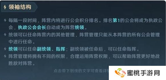 游戏有四大初始阵营,每个阵营内部都会产生一个阵营统领,想要成为阵营统领需要满足两个条件:第一,必须是该阵营中任意公会的会长,第二,每隔一段时间,阵营内会进行公会积分的排名,排名第一的公会成为执政公会会长自动成为阵营统领。