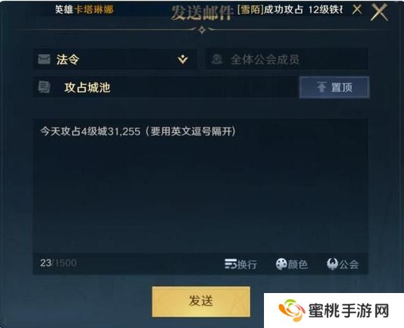 1、设置邮件 邮件是阵营管理的重要工具,通过邮件向阵营内的全体领主下达作战指令、传递相关信息,这是阵营指挥最有效的手段之一。邮件主要分为法令邮件、阵营邮件、公会邮件和系统邮件。 其中法令邮件一般由阵营统领、副统领、指挥进行发放,通常都是攻城时间、集结坐标等重要信息,可以设置置顶。阵营邮件所有管理人员均可以发放,一般为阵营任务、集结作战等方面的信息,而公会邮件则属于公会内部信息传递渠道。