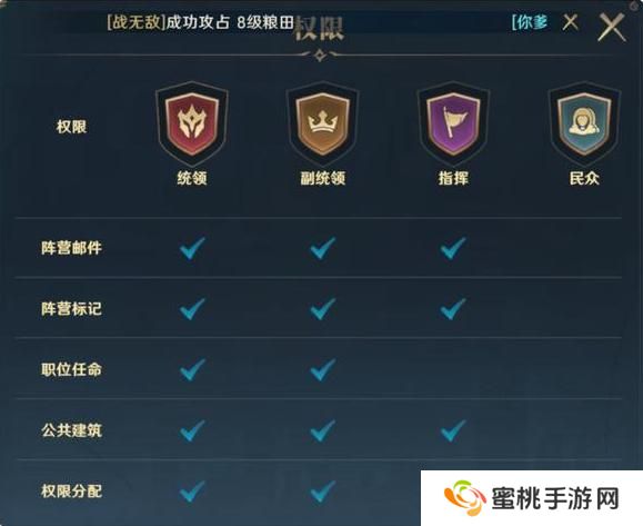 其中比较关键的权眼是阵营征召,阵营统领或副统领花费少量流品可以强制驱离同阵营玩家,或将被占领土地重置为中立状态。指挥的初始权限包括阵营部件、阵营标记、阵营建筑、法令邮件、编辑公告、发布悬赏、操作泰坦和阵营策令等。