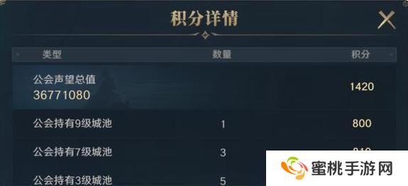2、积分结构 公会的积分决定了自身能否成为执政公会,而积分主要是由公会声望积分和公会城池积分两部分组成。因此,想要成为执政公会,不但要努力的提高公会等级、增加公会人数,还需要占领一定的城池才有机会哦。