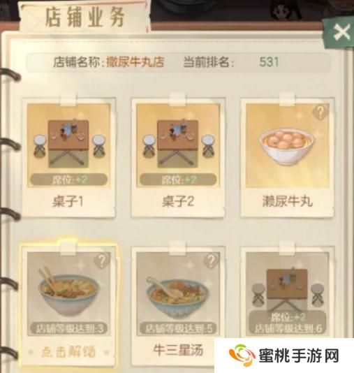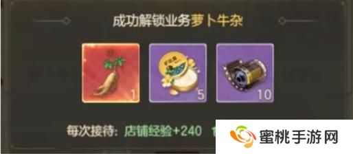 活动界面的右下方还有一个业务图标,点开可以看到不同店铺等级可以解锁不同业务。这里需要注意的是,店铺等级在达到要求经验时,会自动升级。此时需要手动解锁业务,不然顾客不会要新菜品,解锁相关业务时,可以看到成功提示。