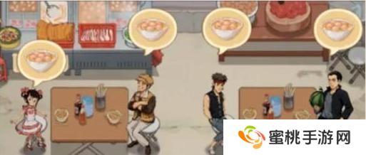 点击“开始营业”,就进入到了摊位页面。顾客会从排队处走到摊位的座位上,并表达想要吃什么。老板们只需要点击一下,就算接待一次顾客。根据不同菜品,可获得不同数值的经验和积分。