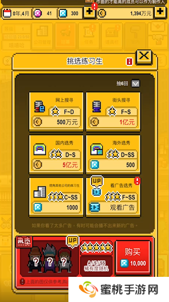 1.在公司的规模扩大之后,你还将能够招募更多的练习生,招募所花费的金额越多,练习生的属性也会更好。