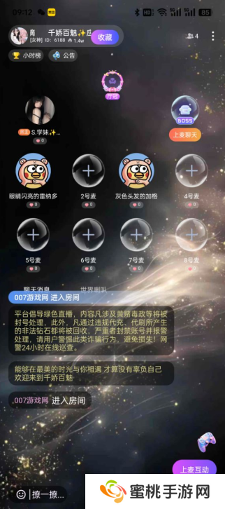 2、提供语音直播功能,创建自己的直播室,与观众互动,分享生活;