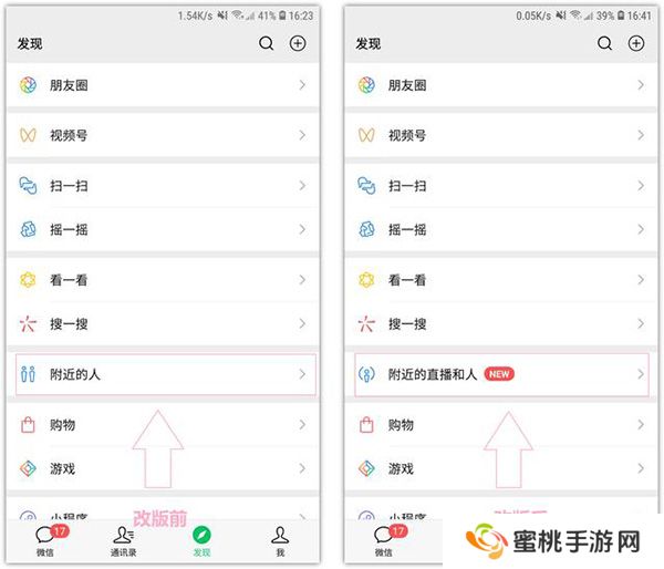 二、发现页改版打开微信点击底部的【发现】,将会看到【附近的人】变成【附近的直播和人】,新增了视频和直播功能,里面的视频和直播,都来自于视频号哦。