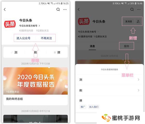 三、公众号改版本次更新,公众号界面也有所改变,移除了“进入公众号”和“不再关注”按钮;右侧添加了“发消息”和“取消关注”按钮;菜单栏被添加到【服务】栏目。