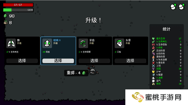 4、击杀怪物能够获取到一定的经验值,左上角绿色的经验条满了之后就会升级,你可以从多种随机的能力当中挑选一种进行提升。