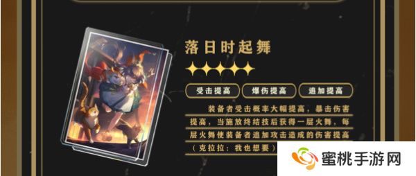 装备者受击概率大幅提高,暴击伤害提高,当施放终结技后获得一层火舞,每层火舞使装备者追加攻击造成的伤害提高。