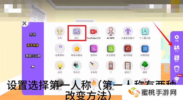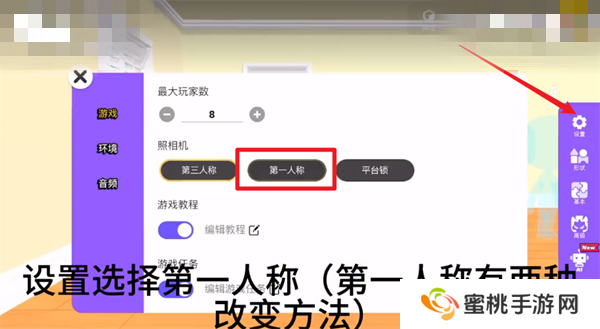 4、进入到空房间的模板之后,玩家们要再右边的【设置】里面将照相机调整成【第一人称】。