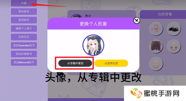 8、然后点击左侧的头像,并在弹窗中选择【从专辑中更改】。