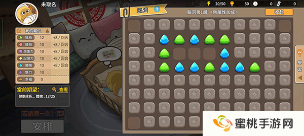 3、通过挖脑洞的玩法可以提升小孩的属性值,不同类型的元素格会增加不同的属性。