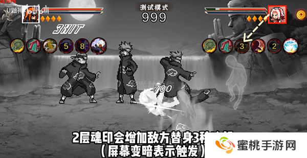 人间道佩恩技能或奥义命中会增加敌方1层封印魂印,2层魂印会增加敌方替身3秒冷却(屏幕变暗表示触发),3层会降低敌方移速5秒(屏幕变暗同时敌方身上有减速特效),4层会造成一次百分比伤害并清空层数(屏幕反色)。