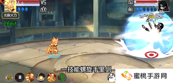 召唤九喇嘛使用尾兽弹自身使用螺旋手里剑,造成大范围的爆炸伤害。