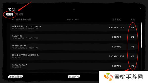 2.在【房间】界面后中,我们可以看到其他玩家所创建的房间,任意点击一个房间即可与其他游戏玩家共同畅玩。