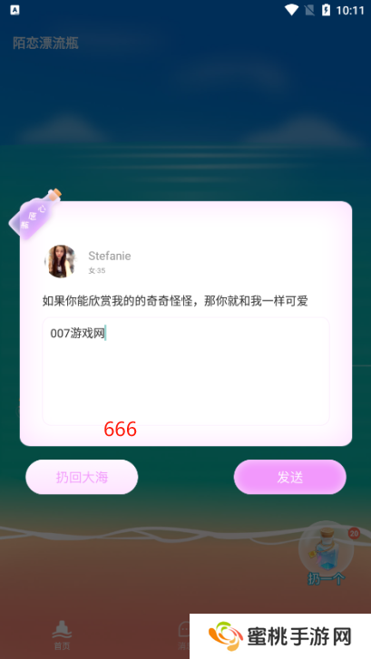 2、通过投掷和捡起虚拟漂流瓶与世界各地的单身人士联系;