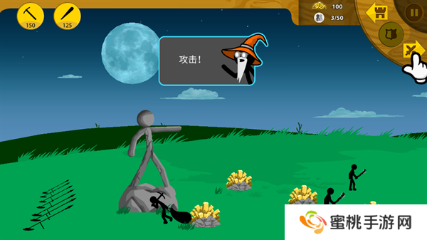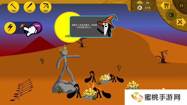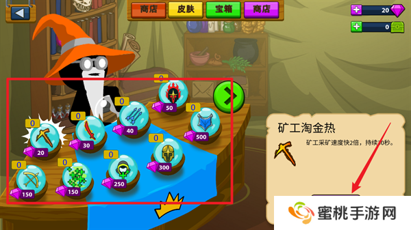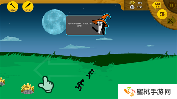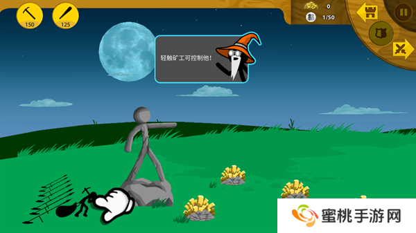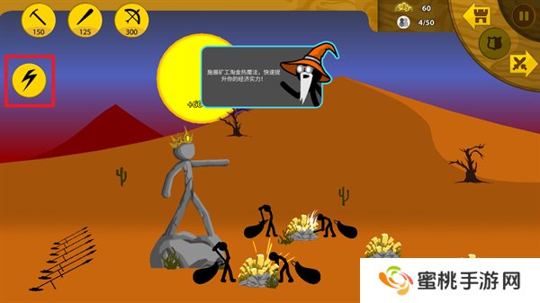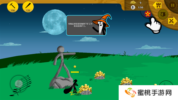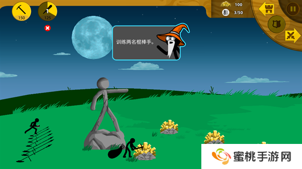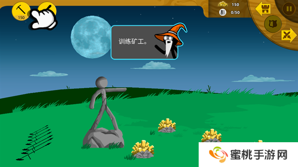 8、矿工帮助**积攒一定的金币资源之后,就能够开始进行战斗单位的训练,点击左上角第二个图标训练棍棒手。