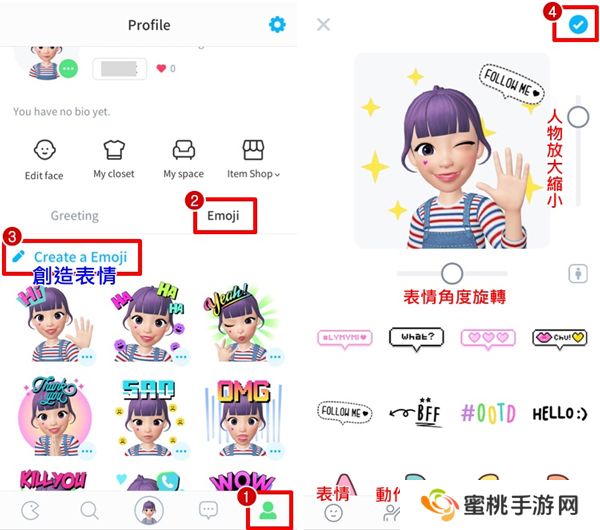 1、【➀个人资料】→【➁表情】→【➂创造表情】→【➃确认】;