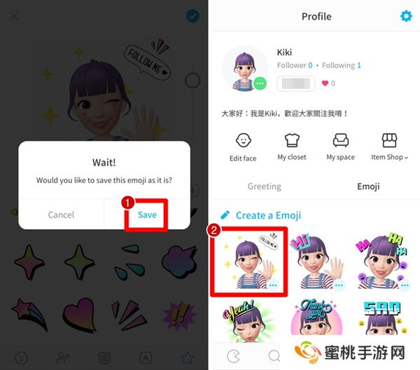2、【➀ Save 储存】→【➁自己做的表情贴就出现啦】;
