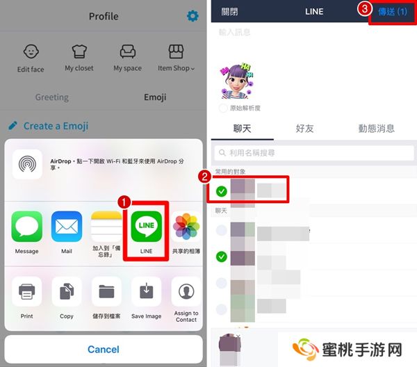 3、点贴图后【➀LINE】→【➁选择要传送的对象】→【➂传送】。