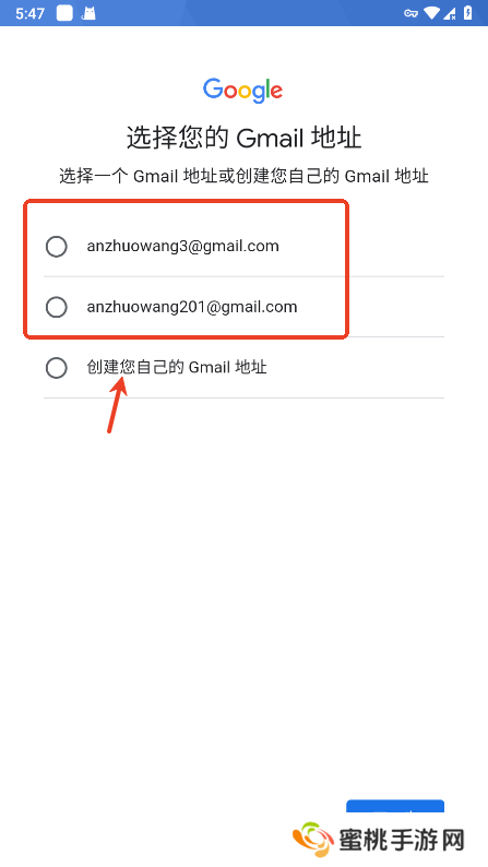 系统会推荐2个谷歌邮箱地址,也可以点最底下自定义;