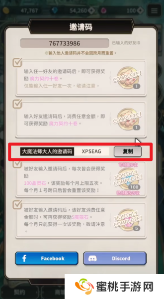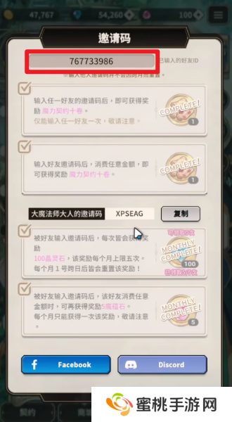 3、下方的这个邀请码就是自己的邀请码,让其他的玩家们输入这个邀请码,自己就能够获取到100晶灵石,每个月上限5次,如果玩家们有空闲时间的话,可以通过登出账号并使用访客登录的方式来填写自己的邀请码,从而快速的获取到500晶灵石。