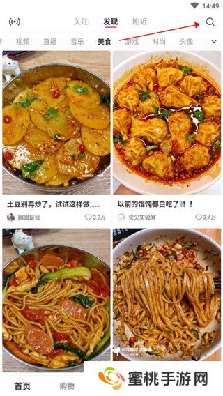 2、进入到软件后,可以选择上面的美食,进入到美食页面,就可以看到很多的美食分享,也可以选择右上角来搜索你想了解的美食。