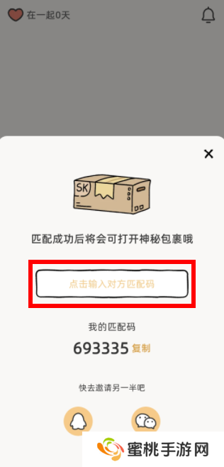 3、同样,也可以将自己的匹配码复制发送给对方,让对方进行匹配,还能通过qq和微信区邀请另一半。