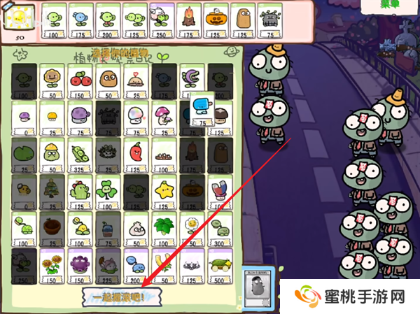 1、玩家们首先需要挑选自己出战的各种植物卡牌,并点击下方的一起摇滚吧来开始进行战斗。