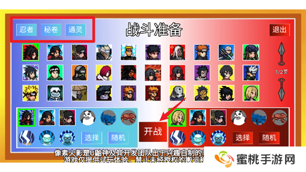 4、在战斗准备界面玩家们点击左上角的选项选择使用的忍者和秘卷通灵,选择完成点击开始。