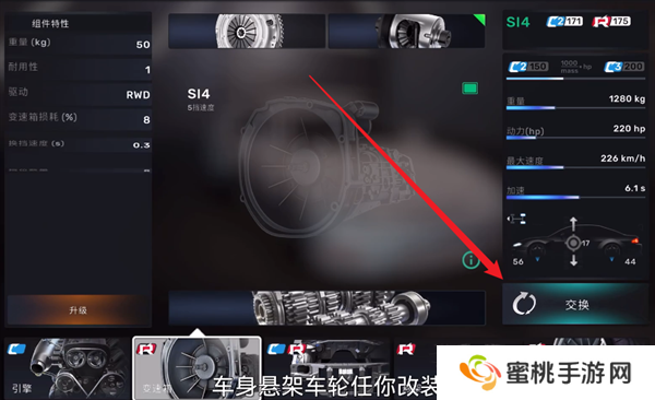 5、选择自己满意的部件,并点击右下角的交换,你就能够完成改装的操作,除此之外,你也可以点击左下角的升级按钮来对自己的部件进行升级。