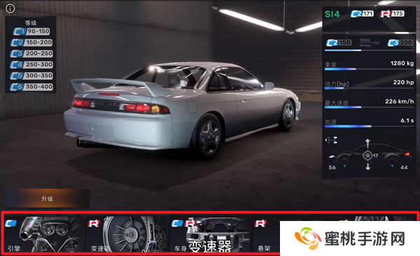 4、在这里你将能够对音擎、变速箱、车身、悬架以及车轮进行改装。