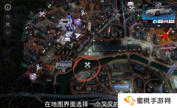 2、进入地图界面之后,在地图上面寻找扳手的改装店图标,点击图标就能够完成传送。
