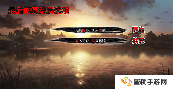 6、在最后剧情分支里面选择【追随闯将,加入闯军】,触发结局【同生】;选择【杀入王府,诛灭豚妖】,触发结局【共死】。