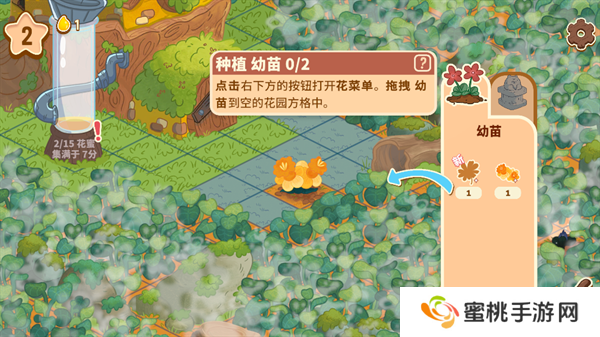 7、将花朵菜单里面的幼苗拖动到花园的方格当中,就能够完成种植。