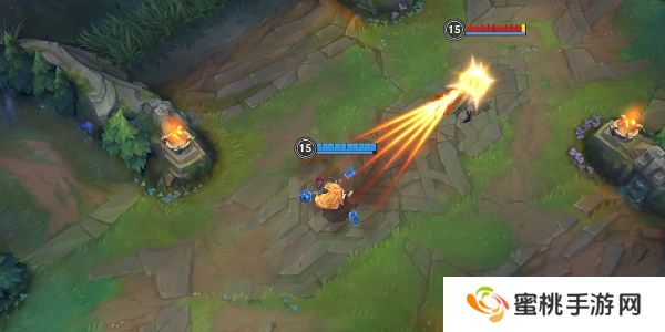 发射一波由5颗**组成的弹幕,对首名命中的敌人造成70魔法伤害,每有一颗**命中敌方英雄,附近的炮台就会获得20%能量。 在一枚**命中敌方英雄或野怪后,后续**仅会对其造成20%魔法伤害,命中小兵时提升至60%。