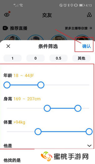 3、在条件筛选界面可根据特定条件进行用户搜索,选定条件后,点击右上角的“确定”,即可进行搜索;