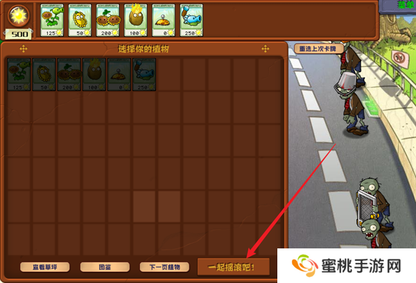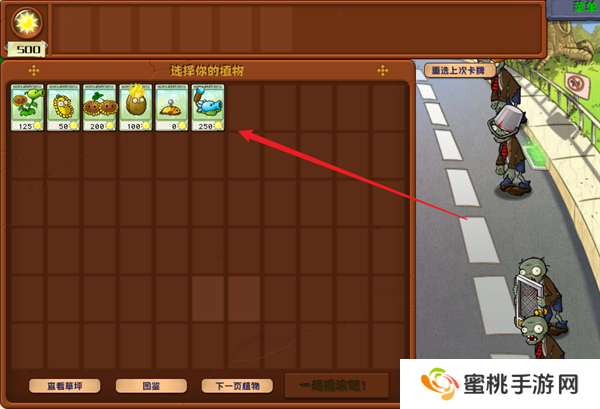 6、你可以在右侧看到这一个关卡内部需要进行作战的僵尸,并从左边选择自己出战的植物卡牌。