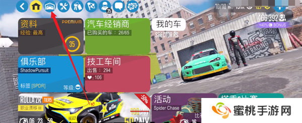 1、玩家们进入游戏之后,首先需要点击主界面上方的第二个按钮,进入到自己的车库当中。