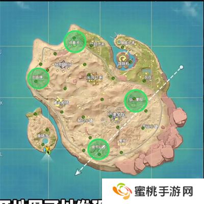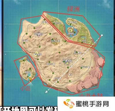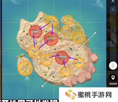 这是喵沙岛高级物资地点(红区域)及中等物资地点(黄区域)。