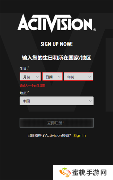 2、进入到注册界面之后,你需要输入自己的生日以及所在国家/地区,然后点击立即注册。