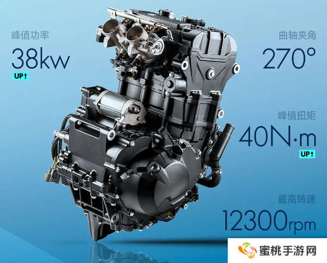 本站从官方介绍获悉,这款新车采用 449cc 超级平台,发动机峰值功率 38kW、峰值扭矩 40N・m,曲轴夹角 270°,最高转速 12300rpm。