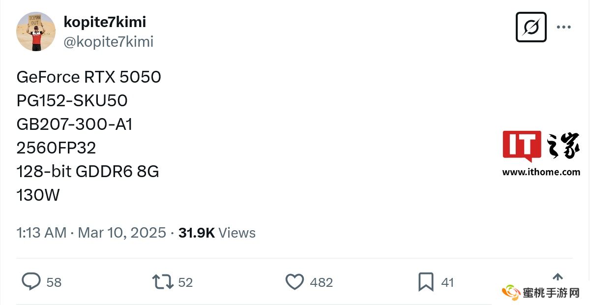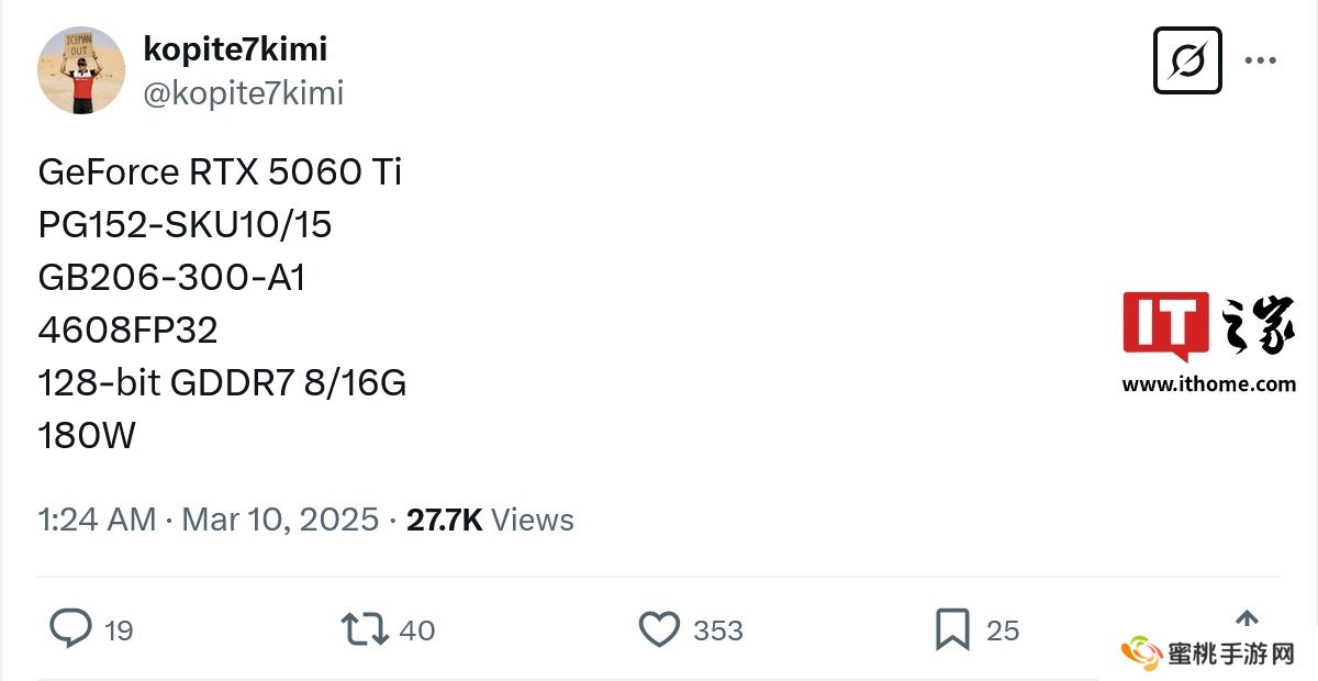 本站 3 月 10 日消息,消息人士 @kopite7kimi 北京时间今日在 X 平台曝光了英伟达 GeForce RTX 5060 Ti 和 RTX 5050 两张显卡的详细参数,这两款产品分别基于 "Blackwell" 架构的 GB206 与 GB207 核心。
