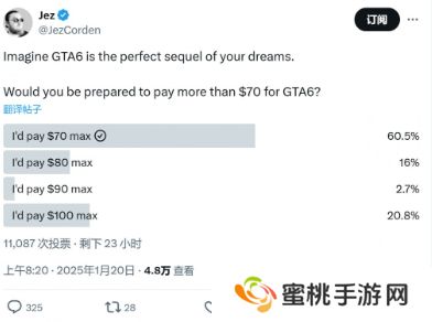 对于这种分析,业内记者Jez Corden在社交媒体上发布了一个调查。他说:“假如GTA6是你梦想中的完美续作,你会支持它超过70美元的定价吗?”随后给出了四个选择,分别是最高70美元,80美元,90美元和100美元。