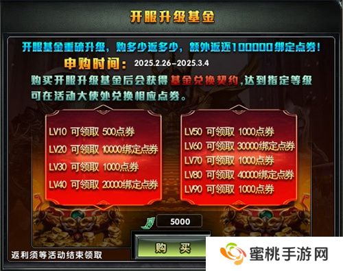活动期间内购买开服基金,活动结束后可到【活动大使】处获得超值返利,每达到10、20、30、40、50、60、70、80、90级时都可领取不同数额的返还点券或者绑定点券,让坎特拉之路更加顺畅。