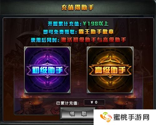 活动期间内累计充值金额超过198,即可免费获得霸王助手徽章,使用后可同时开启30天霸王初级、高级助手功能,包括自动修复道具耐久度、自动售卖、一键修理等功能。徽章不可重复获得,每人仅可获得一次。