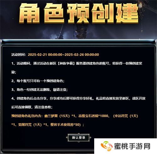 活动期间,通过活动在新区【种族争霸】服务器创建角色的账号,将获得一份预创建奖励;