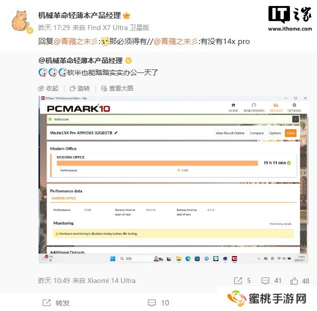 本站 3 月 8 日消息,机械革命轻薄本产品经理@来听听阿璞怎么说 昨日放出了一张关于“无界 15X Pro”的 PCMark 10 测试截图。他透露,机械革命未来还将推出无界 14X Pro。