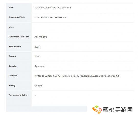 《托尼霍克职业滑板3+4》在新加坡通过评级 即将公布